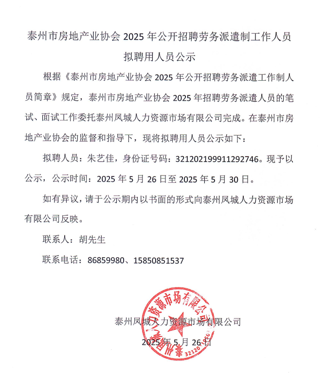 泰州市房地產(chǎn)業(yè)協(xié)會2025年公開招聘勞務(wù)派遣制工作人員 擬聘用人員公示